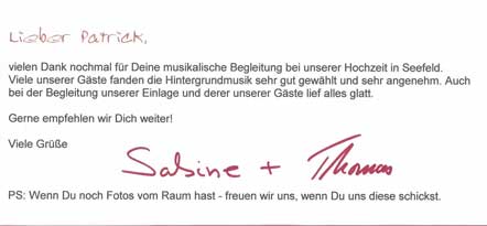 „Danke, Bastian, dass du unsere Hochzeit mit so viel Stimmung, Leidenschaft und guter Musik erfüllt hast. Du warst ein echter Glücksgriff!“
