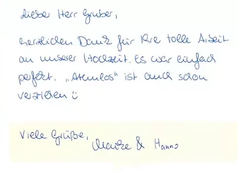 Unser Anspruch ist immer derselbe: Wir möchten, dass jedes Brautpaar mit einem Lächeln, einer warmen Erinnerung und ganz viel Freude an den eigenen Hochzeitstag zurückdenkt. Wenn wir das schaffen – so wie bei Claudia und Kai – dann wissen wir, dass wir unseren Job richtig gemacht haben. Und genau solche Rückmeldungen motivieren uns jedes Mal aufs Neue.